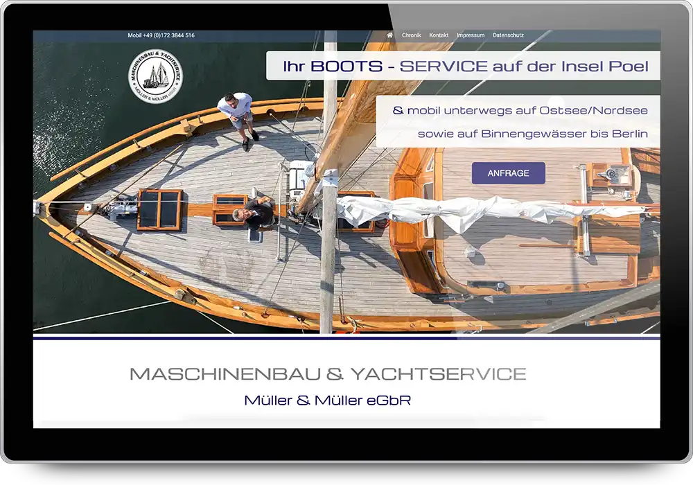 View Larger Image YachtserviceIvS2026-03-19T10:30:34+01:00 Projekt Beschreibung Maschinenbau & Yachtservice Müller & Müller eGbR Webdesign CMS Projekt Details Kategorien: Webdesign Project URL: www.mueller-yachtservice.de Ähnliche Projekte https://radigile.net Prozess-Digitalisierung https://www.stuth-raumausstattung.de Raumausstattung https://www.otm-wismar.de/ Oberflächentechnik https://energieberatung.macala.de Energieberater https://focusing-space.de Focusing https://ergotherapie-ittrich.de Ergotherapie https://derübergang.de Sterbebegleitung https://kubus-anwaelte.de Rechtsanwaltsgesellschaft https://kubus-kommunalberatung.de Kommunalberatung https://www.lipako.de Digitales Druck- & Kopierzentrum
